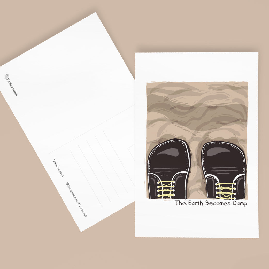 The Earth Becomes Damp 6x4" postcard printed on smooth white 324gsm Mohawk card. Includes a blank envelope to address to recipient.